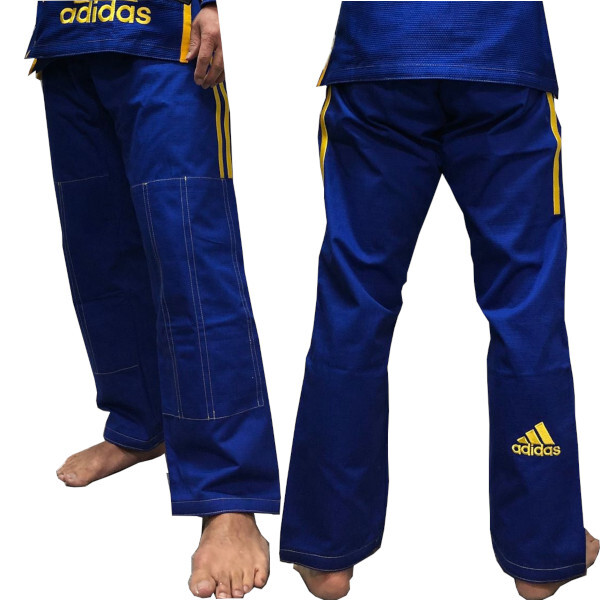 NEW!! アディダス柔術衣パンツのみ コンテストモデル ヴァージョン3.0 adidas BJJ Gipants Contest Model Ver.3.0 ズボン/Pants:リップストップ/Rip Stop 綿100% Cotton ズボンウエストひも: コードタイプ Waist drawstring: Cord type 防縮加工済み/Pre-shrunk 色/Color:青・ゴールドイエロー/Blue with Gold Yellow stripes ポイント/Point: 5%! *アディダス柔術衣のハイエンドモデル。 *高い動きやすさと耐久性を実現。 *肩のストライプと前の刺繍は贅沢な直接刺繍! *パンツの生地は、軽くて丈夫なリップストップ生地を採用。 パンツすそにアディダスロゴ刺繍がすそより上15cm以内にありますのでIBJJFの規定では試合でご着用できませんので練習用としてご利用ください。 サイズ目安表/Size Chart: A0: 159cm - 165cm A1: 165cm - 173cm A2: 173cm - 180cm (これらはあくまで目安です。) 実寸サイズ: A0ズボン-ウェスト幅:約52cm、ズボン丈:約92cm、股下:約70cm A1ズボン-ウェスト幅:約52cm、ズボン丈:約94cm、股下:約71cm A2ズボン-ウェスト幅:約54cm、ズボン丈:約101cm、股下:約75cm ハンドメイドの為、出来上がりサイズが多少前後する場合がございます。 *練習にご着用される場合は問題ございませんが、試合に出場される場合は、各連盟・団体の道着規定に沿って出場することが必要であり、規定が各団体で違う場合もあり、その規定も随時変更になっている可能性がございますので、出場前に主催者にご確認されることをお勧め致します。 *この道着は、海外で製作されており、縫製が荒い(曲がっている、縫い幅が違う等)、縫い直しのある場所がある、製作時に付いたと思われる小さな汚れが付いている場合がございます。競技上問題が無い場合、または洗濯によりその汚れが薄くなるもしくは落ちると見込まれた場合は、ご返品、交換の対象外となることもございますことご了承願います。